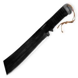 Designed by master knife maker Gil Hibben for the upcoming blockbuster film. Constructed from on solid piece of tree splitting 1060 carbon steel with weathered finish and genuine leather cord wrapped grip and lanyard. This rugged blade has a Rockwell hardness of 59 /-2. It also includes an imitation leather sheath. Do not be fooled by cheap imitations, only United Cutlery has this authentic Hibben custom design! 11 1/4" blade, 16 1/2" overall