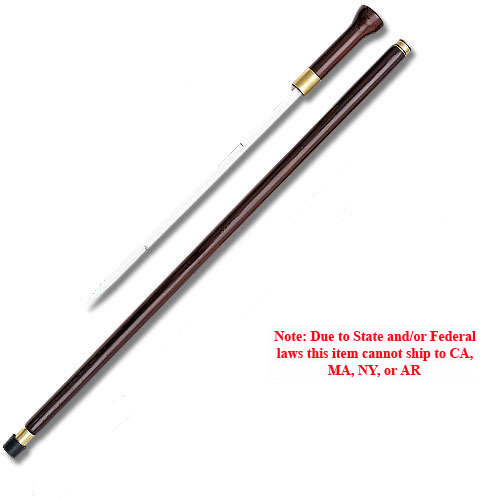 This walking cane is 35" overall with a 17 1/2" mirror polished sword blade fitted neatly inside the cane. It features brushed brass fittings and O-ring seals to keep the handle locked in position while walking. The blade is easily ejected with the twist of the handle. "No Ship To CA, MA, NY, or AR!"