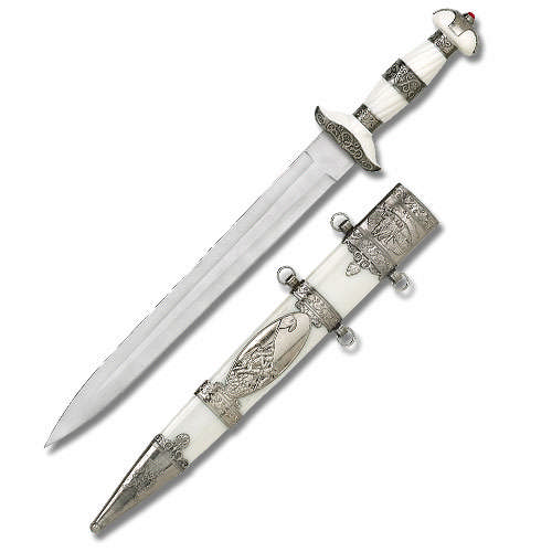 This classic collectible sword is smothered with historical engravings commemorating those who so bravely fought during the Vietnam War. Featuring a 13" mirror polished stainless steel blade. The ivory and silver sculpted handle coordinates with the classic sheath. 19 1/2" overall.